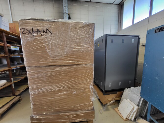 We have a bit of shuffling around to do to before we can have them hooked up to the electrics, including uninstalling the old “Kiln 2”, and moving it out of the way. But we have Paul Mann, our kiln electrician, coming to do all the power install on Monday the 3rd of March. And we will be doing a bit of pre-shuffling with a pallet jack on the Saturday afternoon before then.