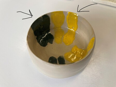 This is an example of what happens when you apply underglaze too thick underneath clear glaze. The arrows are pointing to the thickly applied underglaze which creates air bubbles when fired.