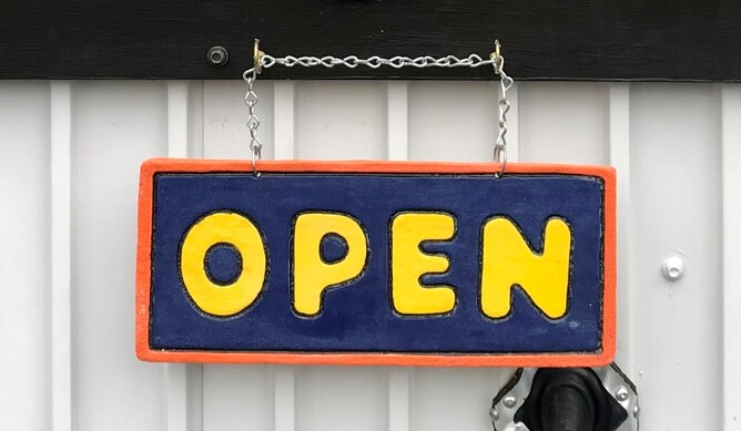 Great team work! Emma Meyers made us this lovely "open" sign and Lara Rye used her metal work skills to make a chain to hang it with.