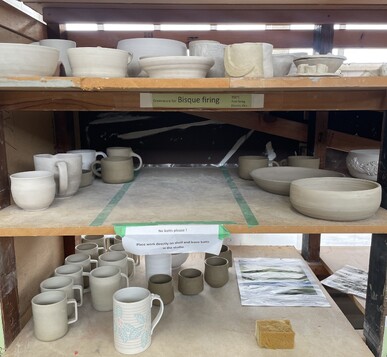 Please do not put wet bisque ware on the bisque shelves unless it is your last class. The glaze room is very cold and during winter your pottery dries slow here. Pottery will dry much faster in the main studio or at home.