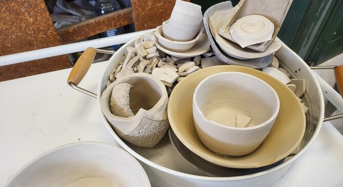 We had a wee bit of an ooops in the kiln room this week - the wheels literally came off one of the trollies we use to load the kilns! Sadly a few pots fell off the trolley too and have broken. So sorry if your pot was among those damaged. We’ve put the shards on the (repaired) trolley for people to identify, so if you find your maker’s mark is among them, please talk to Libby for a firing credit.