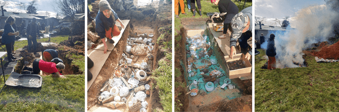 The weather gods weren't kind on Saturday but by all accounts there was a great turnout for the hangi on Saturday and the kai was kapai. The firing went ahead on Sunday and was dug up on Tuesday evening. Thanks everyone who helped with all the work and of course a huge shout out to Caroline for having everyone there. The results can be seen and collected from the shelves at the end of the studio.