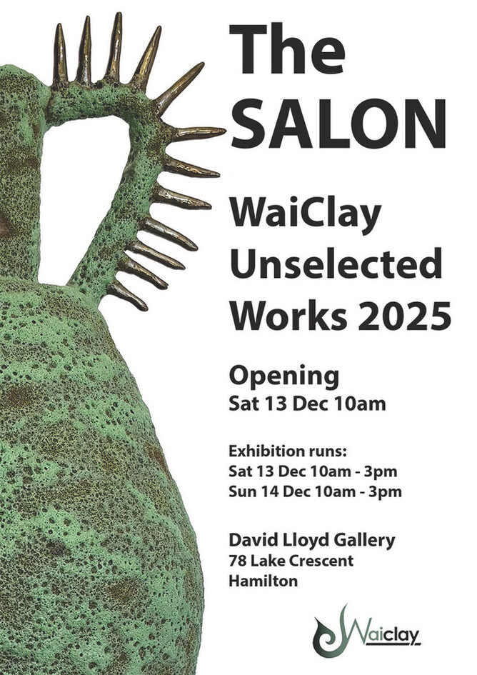 The Salon showcases a vibrant selection of ceramic works that didn’t make the main Waiclay 2025 exhibition, but still shine with talent and individuality. Opening 10am, Saturday 13 December at David Lloyd Gallery, Hamilton, this fun pop-up exhibition celebrates the passion and creativity of Aotearoa’s clay community. Make a weekend of it - catch both Waiclay and The Salon in Hamilton, 13 - 14 December