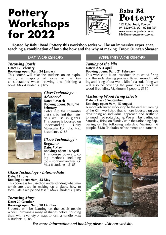 Rahu Road Pottery has the following workshops coming up in 2022: