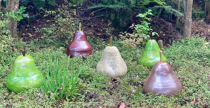 "Stories of the Landscape is now on at The Sculpture Park at Waitakaruru Arboretum. I was lucky enough to have my Giant pears selected to feature as part of the exhibition. Each pear was hand built and took approximately two bags of sculpture clay weighing 12 kilos each. Built in two sections. The bottom piece first then left for a few days to harden, then coil on to that to finish the top. The stalks were done separately and are hollow and have a steel rod going up inside of them and then attached to the pear body. I will call it luck that out of the six pears that I made 5 made it through to the finish, as pottery can be very devastating some days. They were very heavy to lift into the kiln as I have a top loading kiln so my husband assisted me in this task. We were lifting the sixth one in and got a bit blase about this task and both took our hands away at the same time and crack! Well that was a very sad day in my studio. I hope you find some time to visit the Exhibition as it has been extended for a couple of months as it has proved so popular. There are other ceramic pieces and lots of other mediums of sculptureās to view so it is really worth a visit." Catherine Vowles