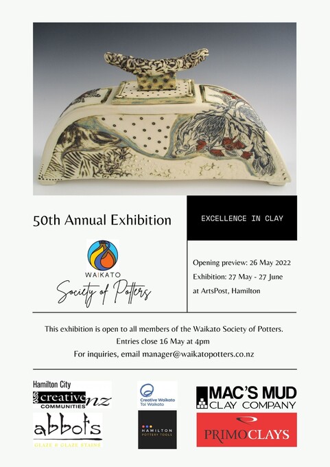 The 50th Annual Exhibition of the Waikato Society of Potters was postponed in October 2021 due to COVID-19 restrictions and delays. We will now be holding the exhibition in 2022.