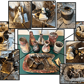 Surfaces of pots were embellished the night before with various combustibles and colourants including: